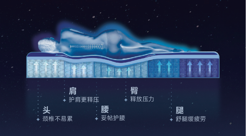 除了睡眠微环境调控,阿波罗床垫在支撑、释压与身体放松层面也形成了较完整的产品逻辑。其一方面通过更平衡的软硬配比与分区承托,帮助脊柱在不同睡姿下更接近自然生理曲度,减轻局部受压与肌肉持续做功;另一方面,通过更稳定的人床界面状态,减少无效翻身与碎片化睡眠。