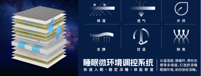 此次发布中,爱依瑞斯重点介绍的 MESHTECH睡眠微环境调控系统,正是率先应用于新品阿波罗床垫中的核心技术。相较于传统床垫更多停留在软硬度和支撑感层面的改善,MESHTECH更聚焦用户在真实睡眠中普遍面临的微环境困扰,例如刚躺下时迟迟难以放松、夜间闷热出汗、湿气滞留带来的黏腻不适,以及因温湿波动引发的频繁翻身、浅睡和睡眠中断。
